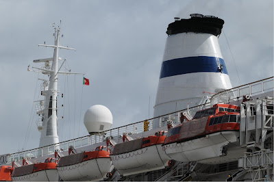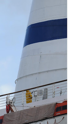 The cruise ship MARCO POLO arrived in Lisbon last Saturday, 22nd March at the end of her final cruise for Orient Line (NCL) and was delivered the following Monday to new owners Global Cruise Lines, Piraeus. The photographs were taken on 26 March when the funnel was being repainted, or to be more correct, when the Orient Line funnel was being painted out. The MARCO POLO is berthed at the Rocha Cruise Terminal in Lisbon and she will stay in Lisbon for the next two weeks.