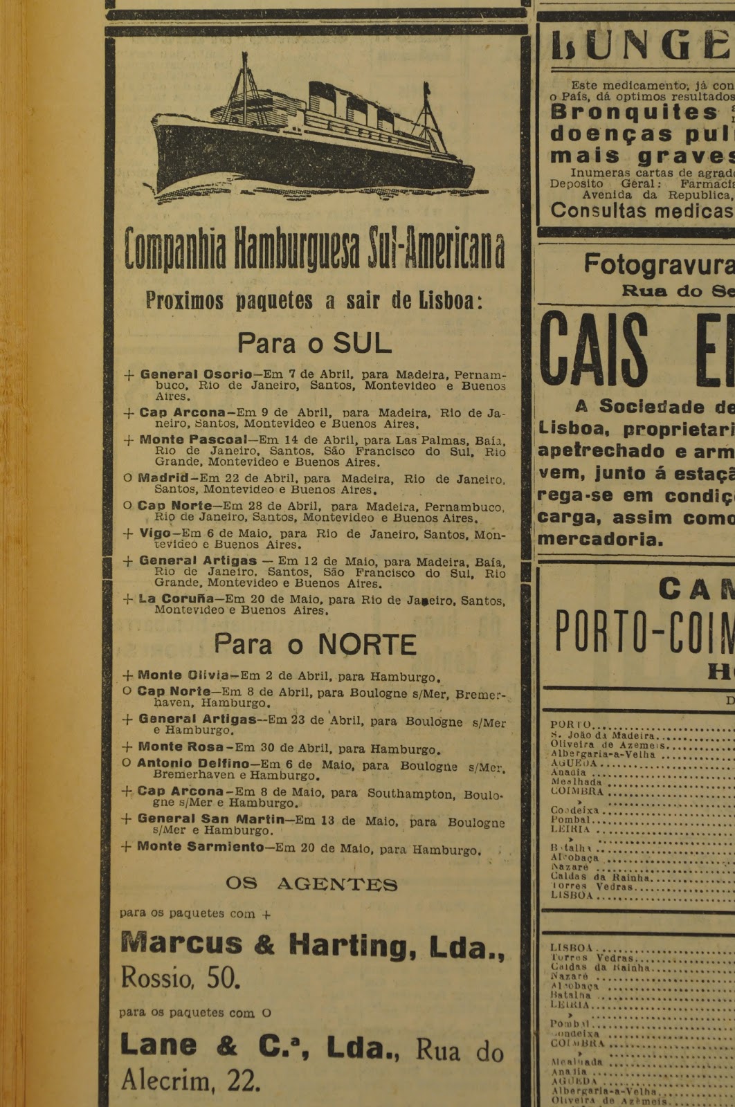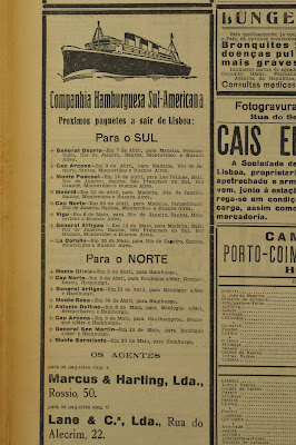 De entre as actividades mais destacadas da Hamburg Sud, de referir o transporte de passageiros em serviços regulares Europa - América do Sul, que conheceram o apogeu na década de 1930 e foram interrompidos em 1939 pela aventura tresloucada do antigo cabo austríaco Adolfo H. Foi o fim de paquetes lindíssimos, de chaminés vermelhas e brancas, cujo imaginário ressoa ainda nos cartazes publicitários da companhia, que são verdadeiras obras de arte. Toda a navegação é uma arte, incluindo as formas publicitárias de outros tempos, como o cartaz que aqui se reproduz, com o navio almirante da companhia, de 1927 a 1945, o famoso paquete a turbinas CAP ARCONA, presença frequente em Lisboa, onde esteve pela última vez em Agosto de 1939.
