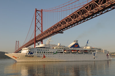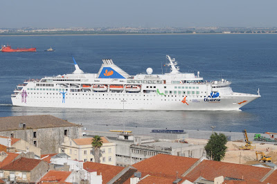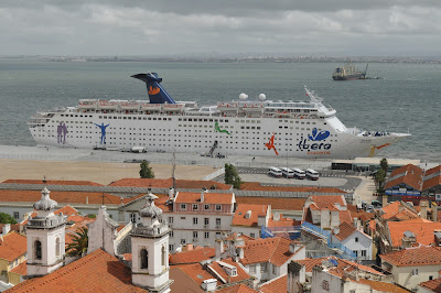 Mais uma grande celebração cruzeirística em Lisboa, com a escala inaugural do GRAND CELEBRATION, que atracou em Santa Apolónia ao amanhecer para largar do Tejo ao fim da tarde. Uma escala de sol a sol a tentar o imaginário popular de Alfama expresso por uma veterana residente local que não resistiu ao apelo dos apitos do CELEBRTATION em manobra de largada: "Deixa-me ir ver o navio sair que eu gosto tanto de os ver irem embora... Quem me dera ir daqui para fora num navio assim..." O discurso foi mais elaborado com referências à vida política local sem esquecer a popularidade que os nossos grandes líderes têm nos dias de hoje junto do povo. E esta reformada com os cortes na alma e na paciência foi generosa em adjectivos e interjeições. No Tejo, o GRAND CELEBRATION apitava num adeus a Lisboa, a proa já entusiasmada com novas aventuras no Rio da Prata e docas de Buenos Aires...