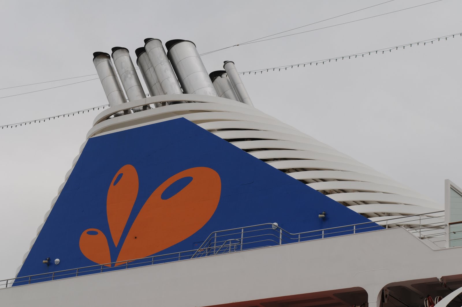She was doing a cruise with Spanish passengers as usual. Her hull decoration is quite poor and does not add any beauty to this square looking French built former Festival ship...