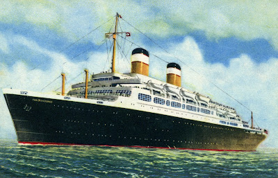 Sometimes one of the Italian liners was sailing from the same berth, Pier 84, at the foot of West 44th St, or the UNITED STATES or the AMERICA was going from adjacent Pier 86. It was usually at 12 Noon -- and what a sight, memory, those thunderous whistles, the streamers, the happy crowds & of course the Moran tugs. Three liners at the same time! It was just magic!