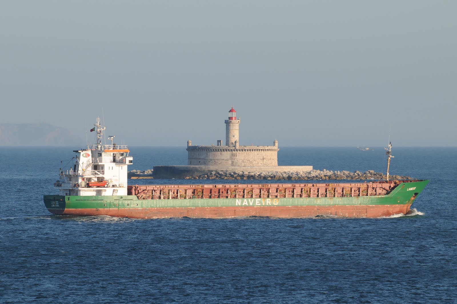 Fotos: o FUNCHAL entrando em Lisboa em Abril último, no final da sua viagem posicional da Austrália para Inglaterra, com escala em Mormugão, e o LAMEGO, um dos cargueiros da Naveiro, que fotografei recentemente em Livorno.
