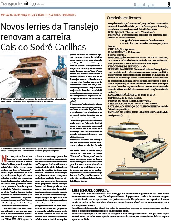 A revista TRANSPORTE PÚBLICO, distribuída com a edição de hoje (26 de Julho) do Diário de Notícias dedica uma página inteira aos novos cacilheiros em acabamento na NAVALRIA e que se destinam à carreira Lisboa (Cais do Sodré - Cacilhas).