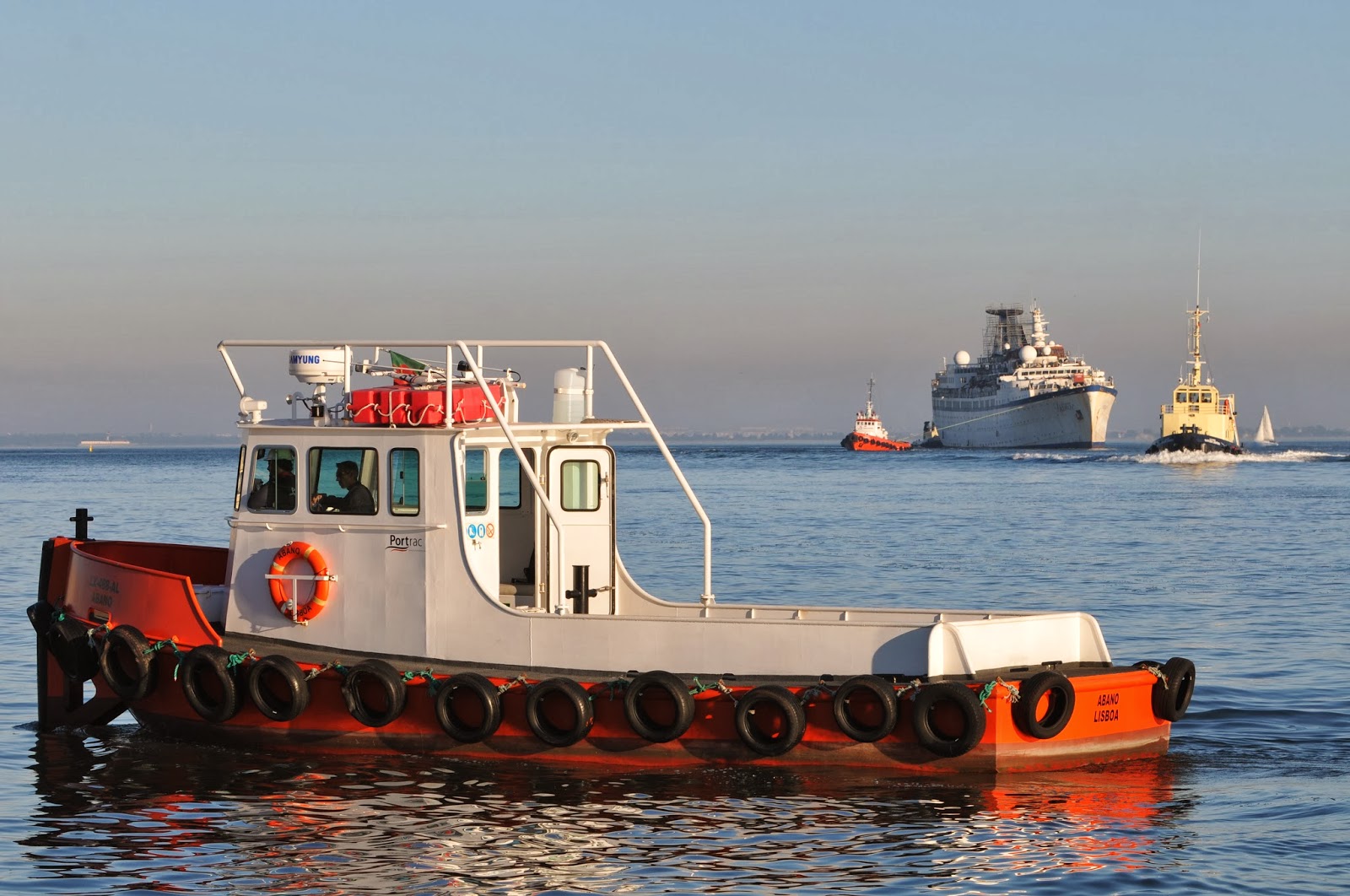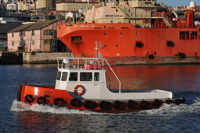 Lancha ABANO a sair do cais da Rocha na tarde de 15 de Outubro de 2013 para mais um serviço, provavelmente de transporte de tripulantes para bordo de um navio fundeado no Tejo. Esta lancha faz parte de uma série de três, construídas propositadamente para assegurarem serviços de apoio à atracação de navios, nomeadamente os graneleiros e navios tanques. As outras duas lanchas são a PIONEIRO DO RIO, a fazer relembrar o antigo rebocador PIONEIRO, e a TAMARIZ.