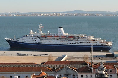 The MARCO POLO leaving Lisbon on 29 January 2010 on her first cruise for new operator Cruise Maritime Voyages.