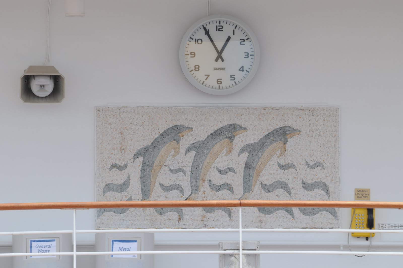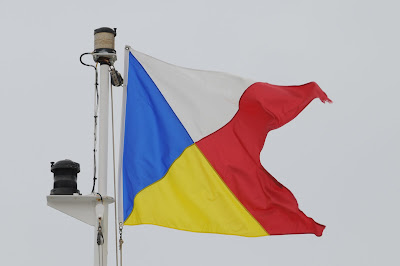 Fotos do ADONIA em Lisboa a 25 de Maio e o distintivo do Comodoro Burgoine, que é a bandeira da P&O com as tradicionais cores portuguesas e espanholas reminiscentes da origem da empresa como Peninsular Steamship Co. em 1837, mas com pontas raiadas...