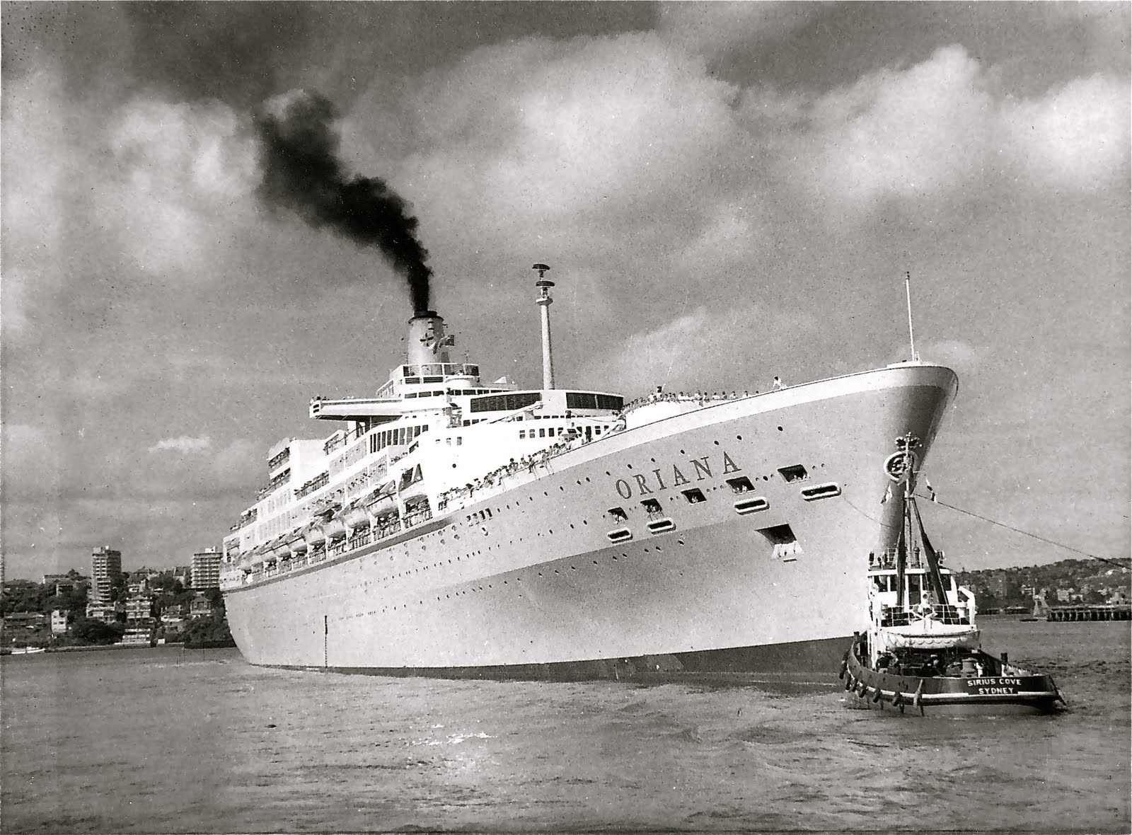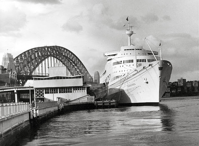 Imagem clássica do terminal de passageiros no porto de Sydney, com o paquete CANBERRA atracado. O CANBERRA entrou ao serviço em 1961 e foi o maior navio de passageiros construído de raiz para a carreira da Austrália. Navegou de 1961 a 1997.