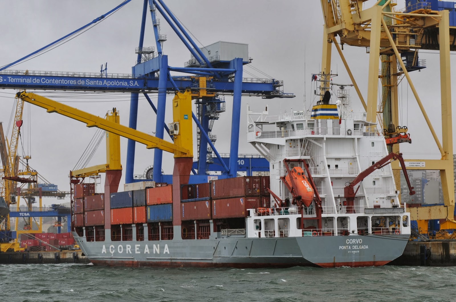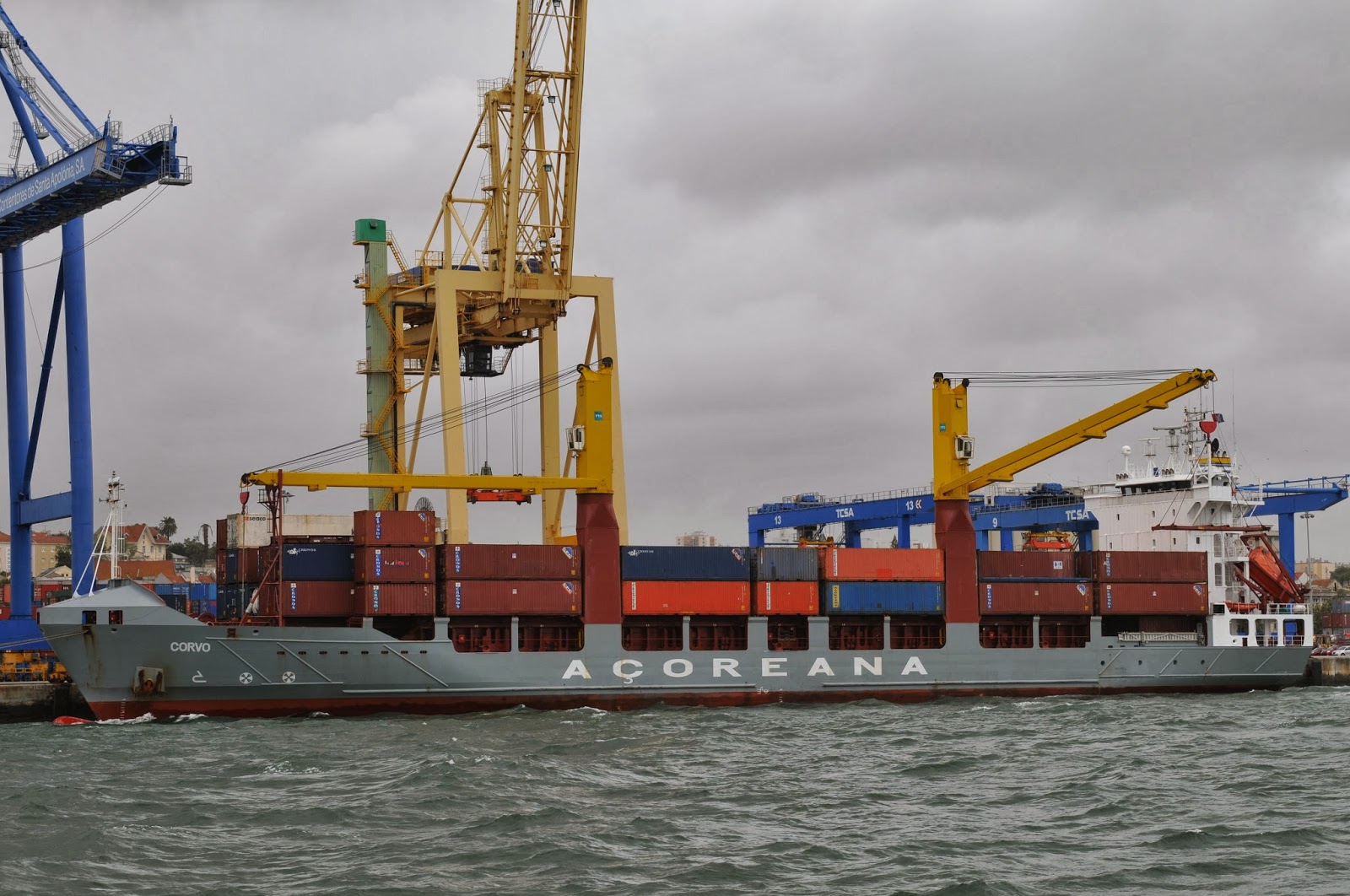 Dois dos mais belos navios portugueses actuais: os porta-contentores CORVO e MONTE DA GUIA, atracados a Santa Apolónia no passado dia 22 de Abril de 2013. Ambos os navios operam nas carreiras regulares Continente - Açores dos armadores respectivos, a Mutualista Açoreana, que é a decana das navegações portuguesas contemporâneas, pois assegura as ligações com os Açores desde 1920, e a Transinsular, que navega nas mesmas águas desde 1985, tendo sucedido às empresas CTM (1974-1985) e Insulana (1871-1974).