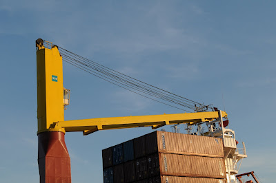 Porta-contentores CORVO atracado a Santa Apolónia no passado dia 15 de Março de 2010, destacando-se uma das suas potentes gruas de 45 toneladas que parece preparar-se para içar meio navio. Apenas uma ilusão óptica, claro...
