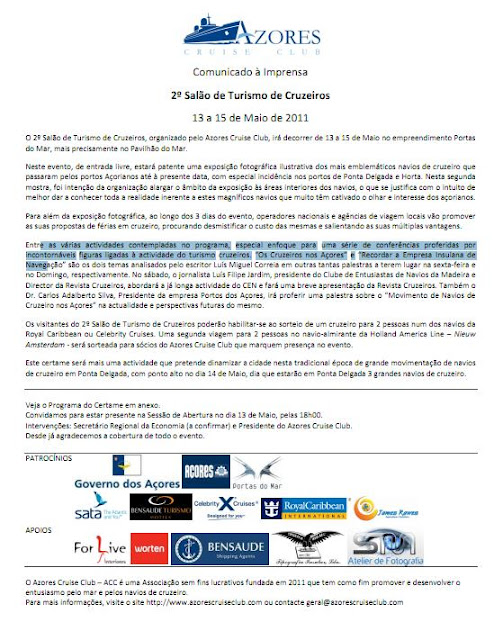 Não percam esta importante iniciativa de divulgação dos navios de cruzeiros proposta para este fim de semana em Ponta Delgada.