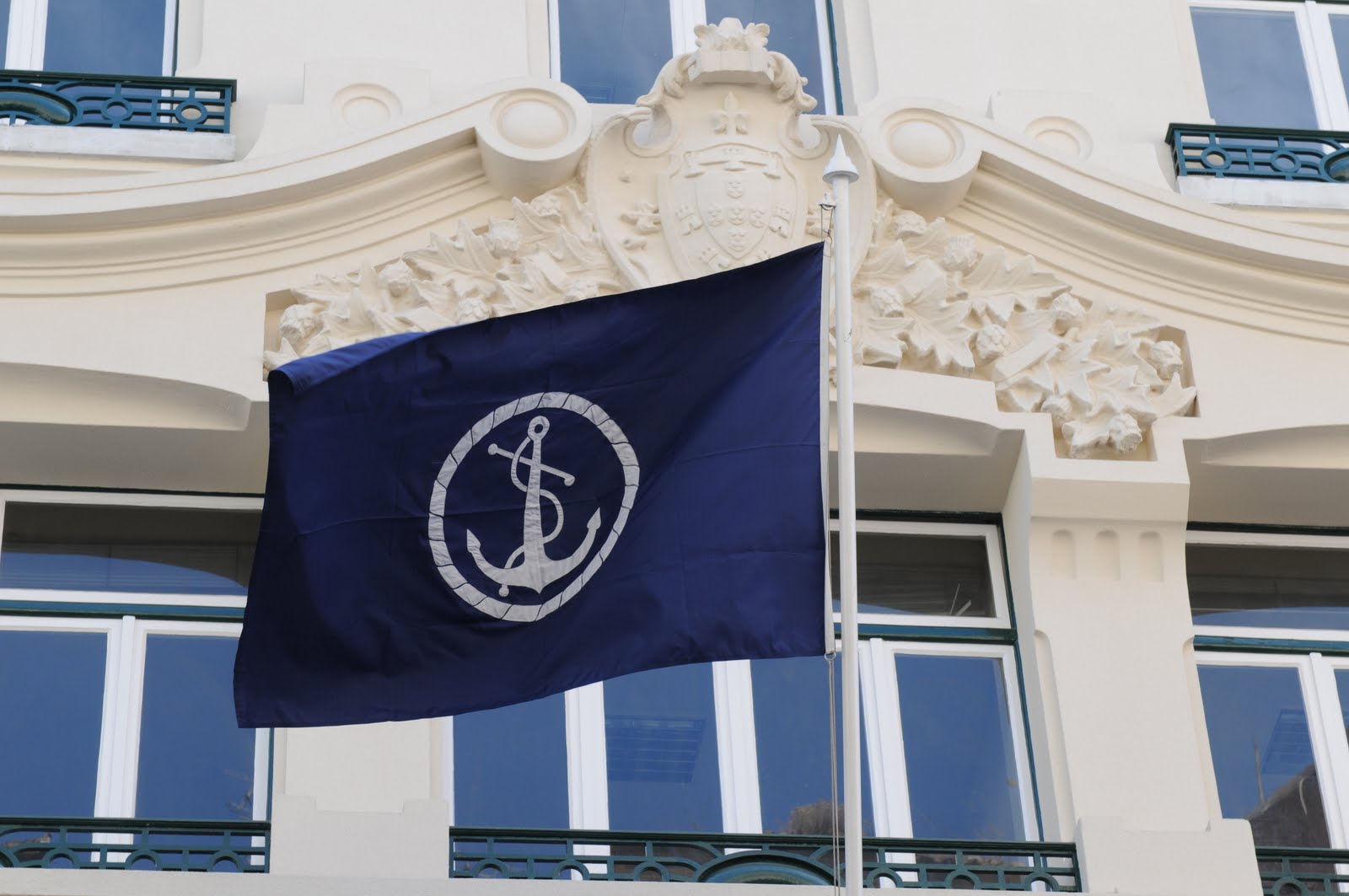 Na varanda do primeiro andar, num mastro branco impecável, flutua uma bandeira azul com uma âncora branca. É uma bandeira do Mar, cheia de significados ainda mais de salientar quanto se pode concluir que é a única bandeira do Mar hasteada na velha Baixa Pombalina, que durante mais de 100 anos foi o centro da nossa vida marítima.