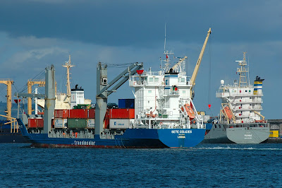 Porto de Ponta Delgada a 30 de Julhos de 2007 com o porta-contentores SETE CIDADES a passar pelo FURNAS, da Mutualista Açoreana