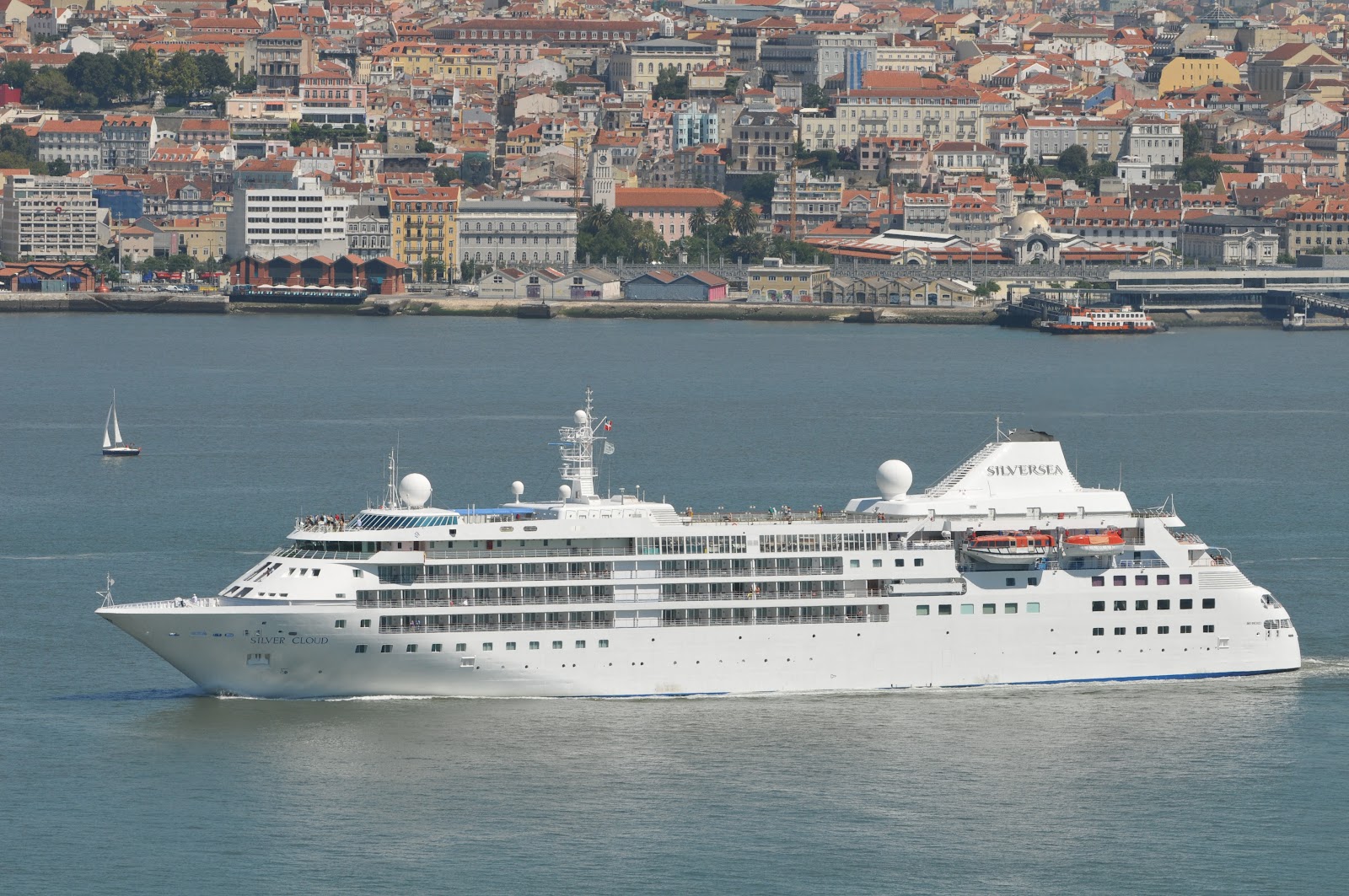 SILVER CLOUD photographed underway in Lisbon at noon on 22 August 2012 at the end of an overnight call. She was one of six cruise ships in port that day. SILVER CLOUD was built in Italy as Silversea Cruises first ship, introduced in 1994 as a 16.927 GT ship with capacity for 296 pax.