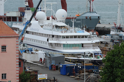 Lisbon docks scene on 2ns November 2010: the old tug ALA, built in Germany in 1922, and the cruise ship SEADREAM II udergoing a refit at the NAVALROCHA shipyard.
