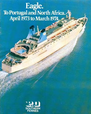 Then Sunward Kloster Ferries operated briefly 19 round voyages with the magnificent SUNWARD, between June and November 1966, when it was decided to movethe ship to Miami originating the following December 19 the start of NCL - Norwegian Caribbean Lines. In 1968 Normandy Ferries started to operate between Southampton and Lisbon with the DRAGON and her French registeed sister LEOPARD and this must have been a positive move because it led to the formation of another company on the P&O Group universe (managed at first by the General Steam Ship Company), the Southern Ferries that placed an order in France for the superb cruise ferry EAGLE. Introduced in My 1971 she served Lisbon until her surprise demise in October 1975 when Paquet Cruises moved in and made an offer for the ship. Soon she joinned the Paquet fleet then comprising the RENAISSANCE, the MERMOZ, the MASSALIA and now the former EAGLE as AZUR.