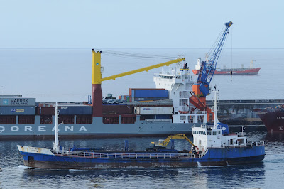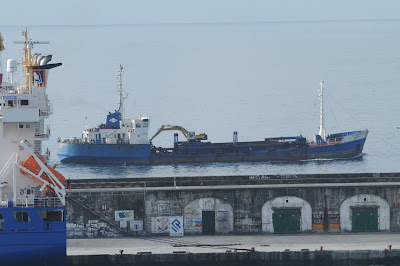 Draga de inertes ATLANTIAREIAS saindo do porto de Ponta Delgada na manhã de 13 de Maio de 2008, vendo-se atracados os porta-contentores CORVO e S. GABRIEL, acabados de chegar do Continente e ainda um graneleiro turco.