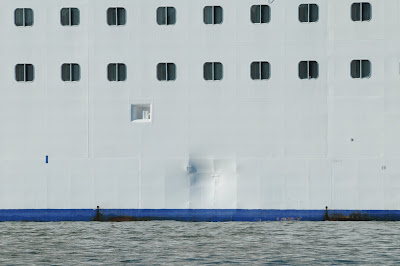 O costado a BB mostra diversas amolgadelas recentes espalhadas ao longo dos quase 280 metros de comprimento deste gigante da subsidiária italiana da Carnival Corporation.