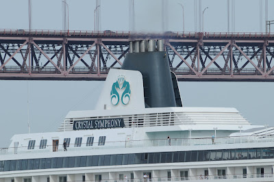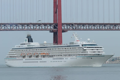 The ultra-luxurious cruise ship CRYSTAL SERENITY called at Lisbon on 2009-06-11 and berthed at the Alcântara cruise terminal. Having arrived at about 5.30 AM, she departed at 6.00 PM in reasonable light, as can be observed from the photos.