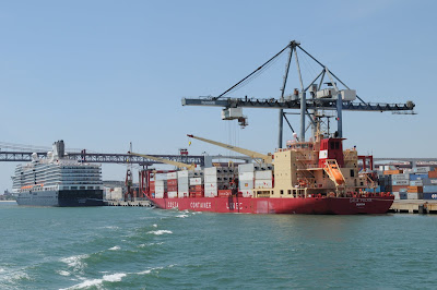 Alcântara cruise terminal and Liscont container terminal with EURODAM and CALA PALMA alongside.