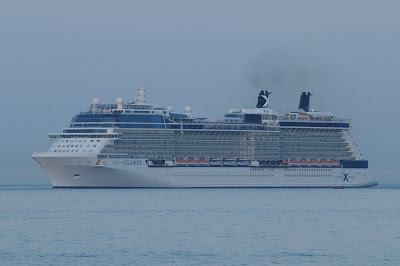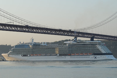 Registámos a chegada, apresentando duas das 157 imagens feitas, a primeira mostra o navio a entrar a barra do Tejo e a segunda a passagem sob a ponte 25 de Abril. O CELEBRITY EQUINOX está atracado em Alcântara e larga pelas 18h00.