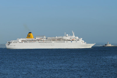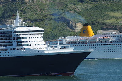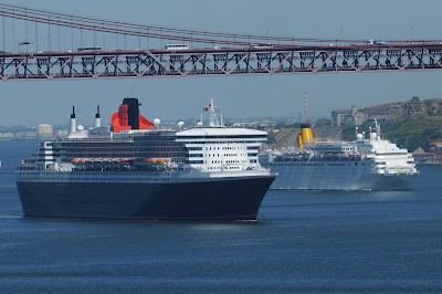 This photograph shows clearly one of the most interesting design features on the QM2, her streamlined upper works and bridge clearly influenced by the design of the QUEEN ELIZABETH of 1940. The QM2 mast on the other way is a smaller replica of the QE2 mast...