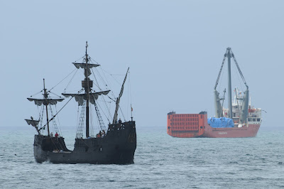 Contraste marítimo ao largo do Porto do Funchal, com a Nau SANTA MARIA numa das suas viagens turisticas e o navio de cargas pesadas italiano STORM fundeado a Sul da Pontinha...
